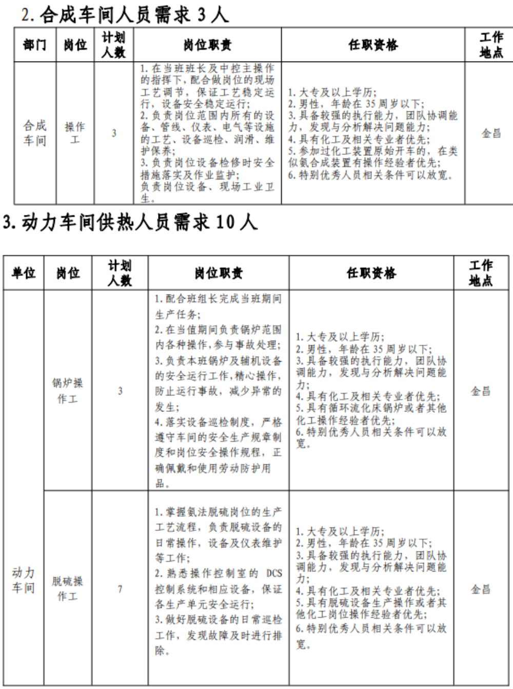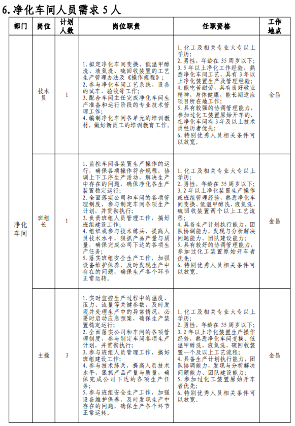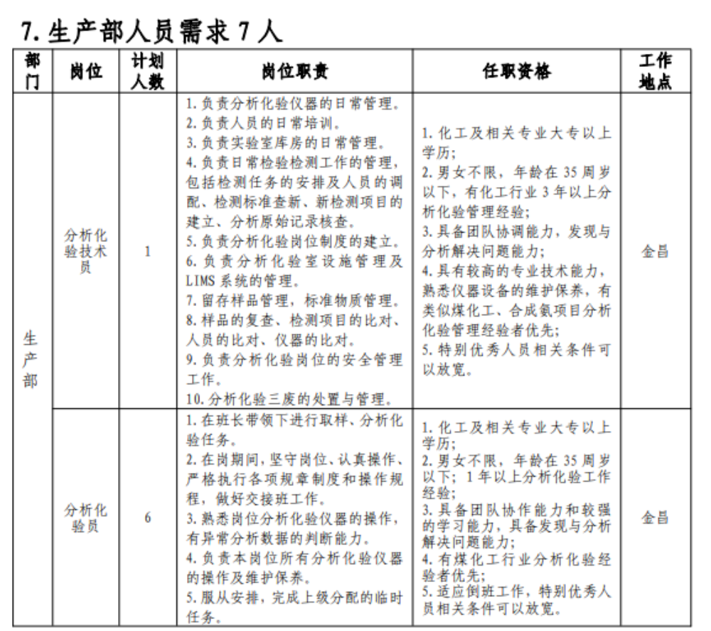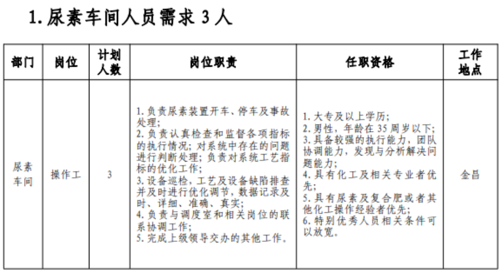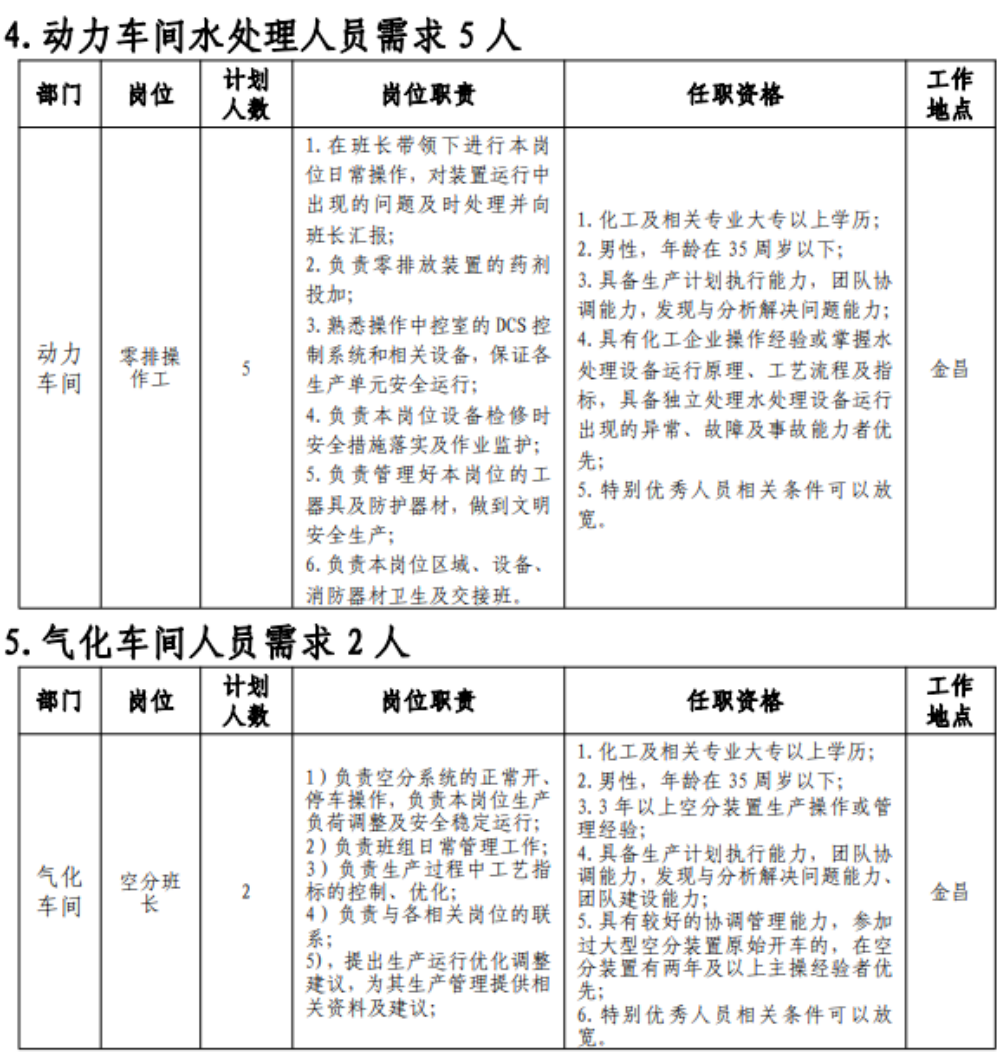(七)具有突出可查业绩或获得县处级及以上奖励或具有相关专业中级以上职称者可适当放宽年岁限制;应聘职员有化工企业事情履历的优先。
