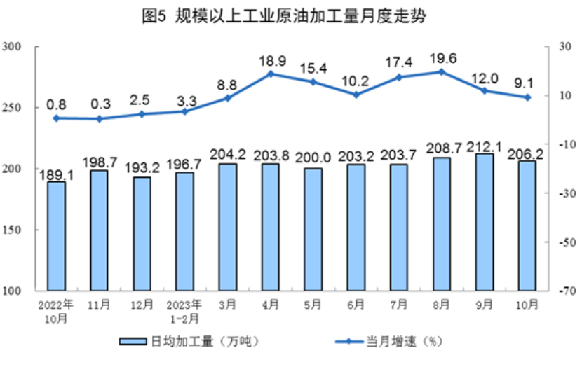 原油加工坚持稳固增添。10月份,加工原油6393万吨,同比增添9.1%,增速比9月份放缓2.9个百分点,日均加工原油206.2万吨。110月份,加工原油61876万吨,同比增添11.2%。