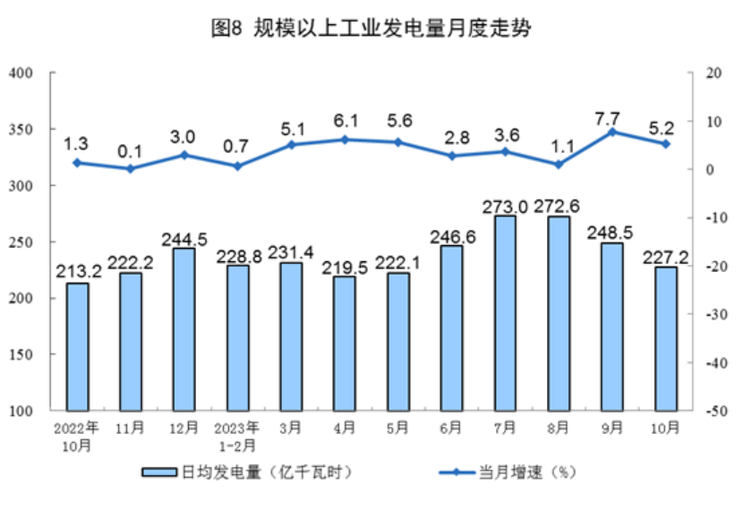 电力生产稳步增添。10月份,发电量7044亿千瓦时,同比增添5.2%,增速比9月份放缓2.5个百分点,日均发电227.2亿千瓦时。1—10月份,发电量73330亿千瓦时,同比增添4.4%。