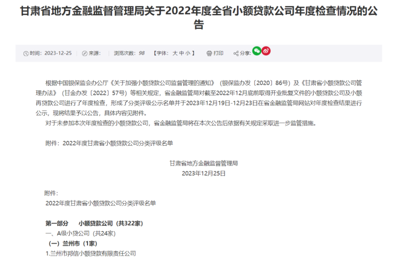 12月25日,甘肃省地方金融监视管理局宣布了对阻止2022年12月尾前取得开业批复文件的小额贷款公司及小额再贷款公司的年度检查效果。在全省24家获评A级的小贷公司中,兰州邦信小贷公司被评为兰州市唯逐一家A级小额贷款公司。