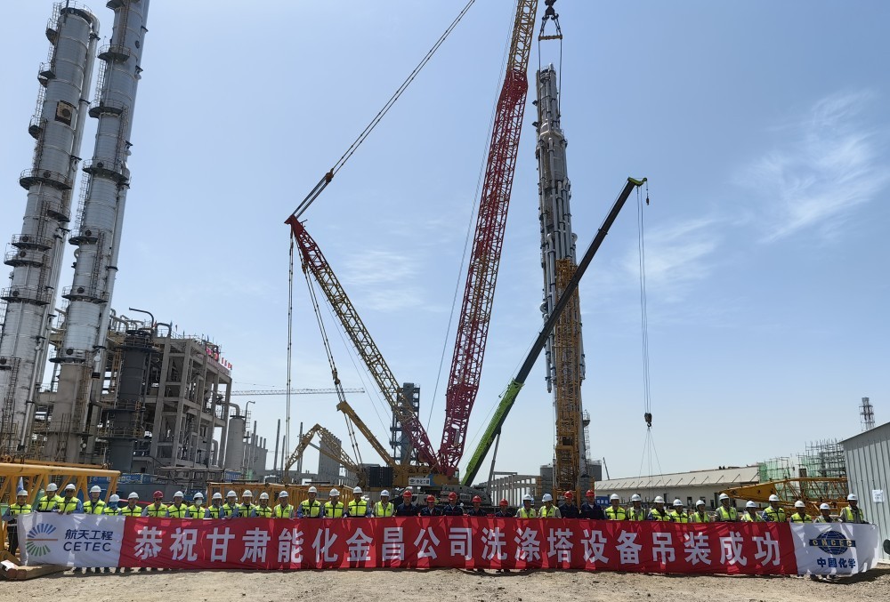 新百胜在线官网集团金昌公司煤化工项目最重 最高单体装备洗涤塔吊装就位