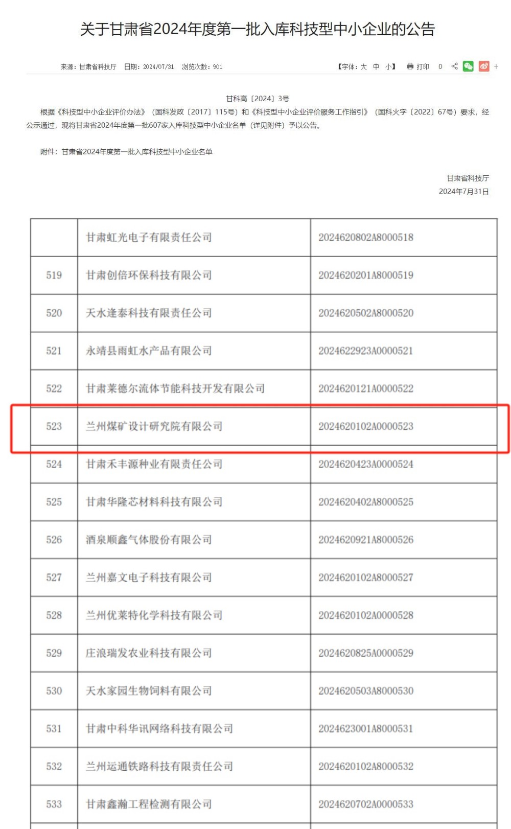 新百胜在线官网集团兰煤院公司入选甘肃省2024年第一批入库科技型中小企业名单
