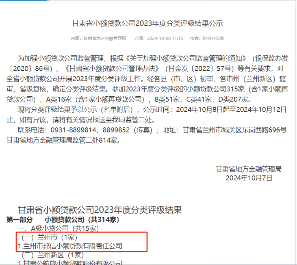 克日,甘肃省地方金融管理局公示了甘肃省小额贷款公司2023年度分类评级效果,新百胜在线官网集团邦信小额贷款有限责任公司获兰州市唯逐一家A级小额贷款公司。