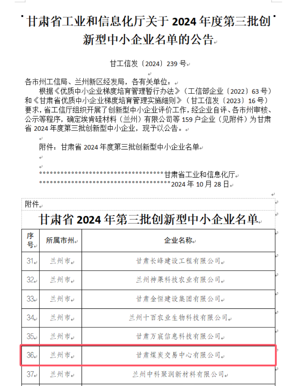 克日,甘肃省工业和信息化厅宣布了《关于2024年度第三批立异型中小企业名单的通告》,甘肃煤炭生意中心被认定为2024年度第三批立异型中小企业。