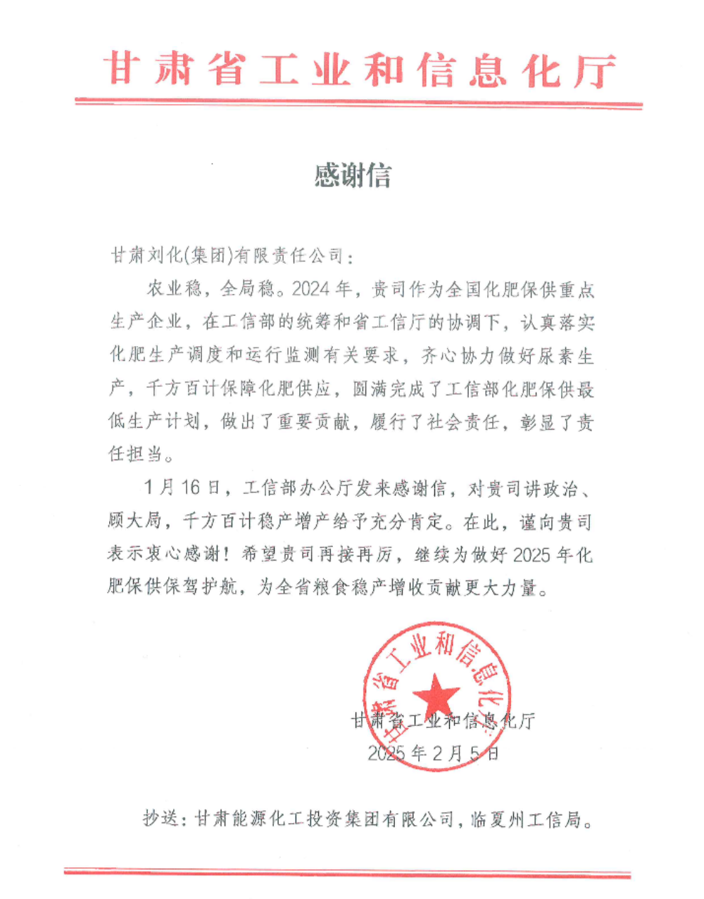 信中指出,2024年,刘化公司作为天下化肥保供重点生产企业,在工信部的统筹和甘肃省工信厅的协调下,认真落实化肥生产调理和运行监测有关要求,同心协力做好尿素生产,千方百计包管化肥供应,圆满完成了工信部化肥保供最低生产妄想,做出了主要孝顺,推行了社会责任,彰显了责任继续。希望刘化公司再接再厉,继续为做好2025年化肥保供保驾护航,为全省粮食稳产增收孝顺更鼎力大举量。
