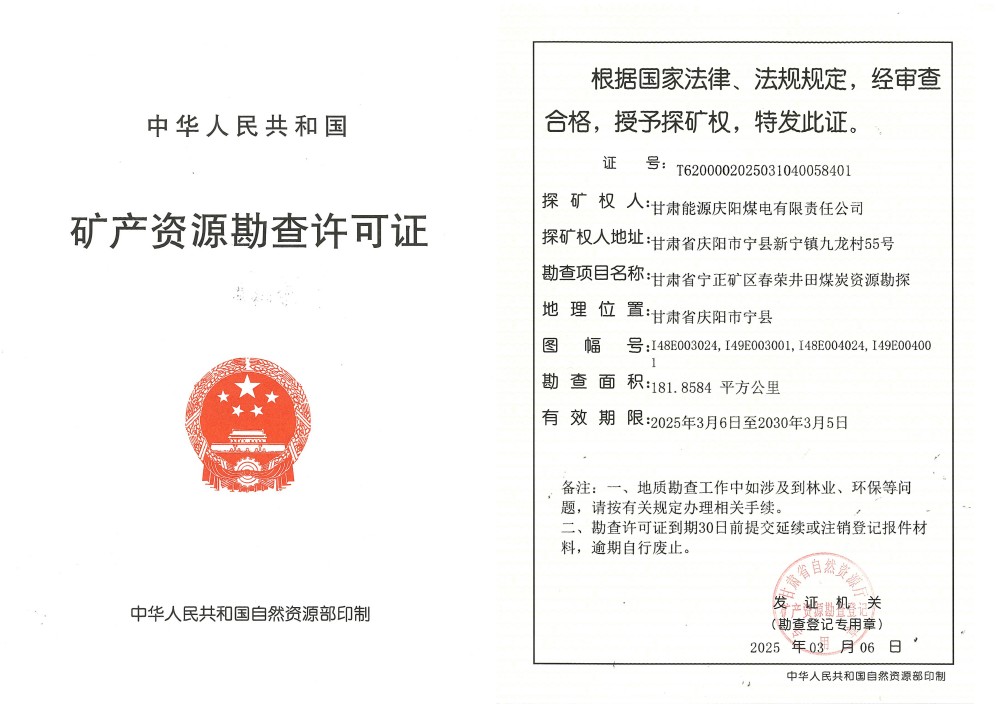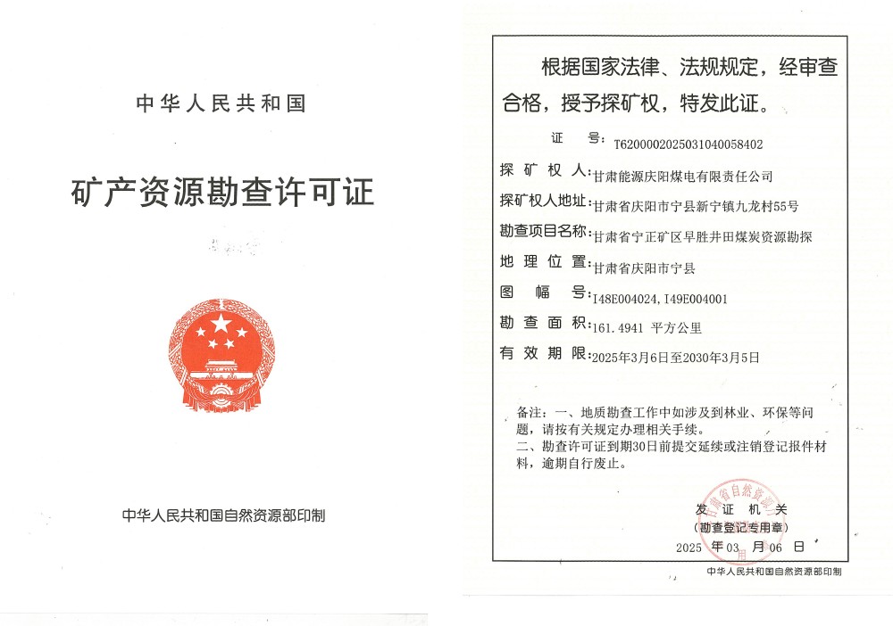 克日,新百胜在线官网集团宁正矿区春荣、早胜井田同时取得甘肃省自然资源厅揭晓的矿产资源勘查允许证,标记着春荣、早胜两个井田勘探事情实质性落地。这是继2024年11月取得九龙川煤矿采矿允许证后宁正矿区资源开发前期事情中的又一突破,将有力推动新百胜在线官网集团“十五五”煤炭总产能实现5000万吨目的。