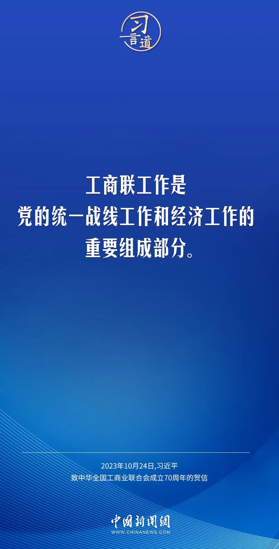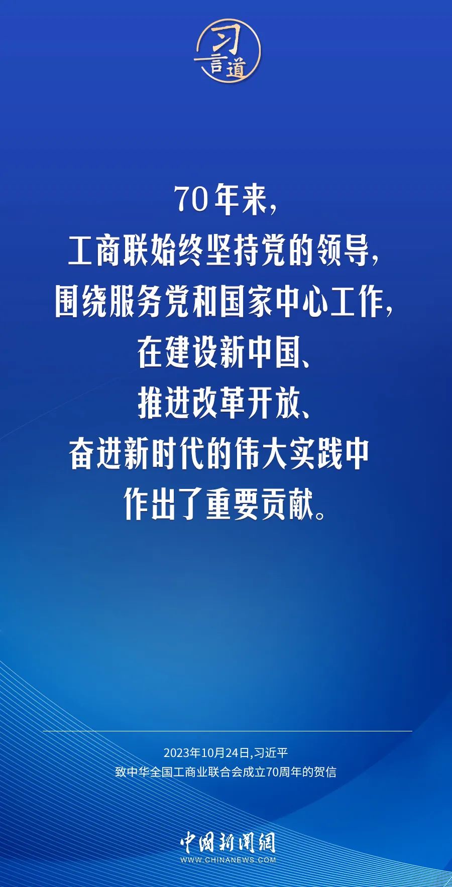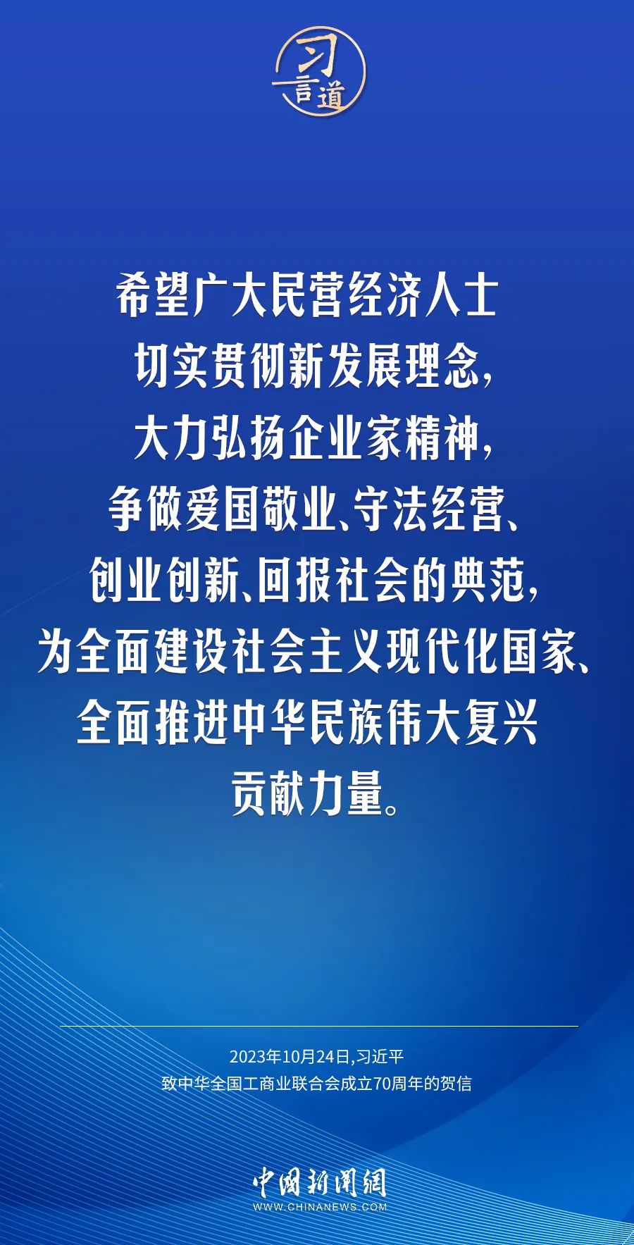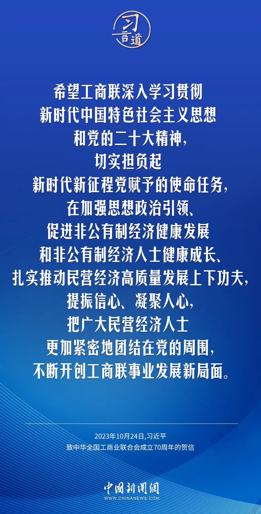 在中华天下工商业团结会建设70周年之际,中共中央总书记、国家主席、中央军委主席习近平发来贺信,代表党中央致以热烈祝贺,向工商联系统全体干部职工和天下宽大民营经济人士致以真挚问候。